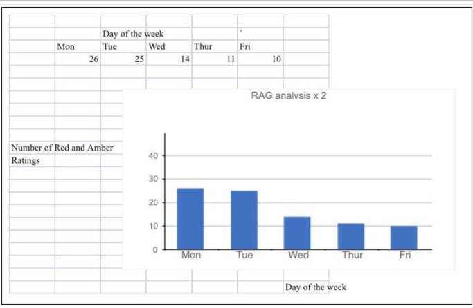 We often find that after the sessions children get to the WOW on the behaviour chart. They are calmer.The RAG analysis (figure below) tracks children’s behaviour daily and the below graph demonstrates that on Fridays when the children receive their Parkour session fewer children receive red or amber ratings. This is positive as Green behaviour means they are following instructions, completing work and using positive language in the centre.